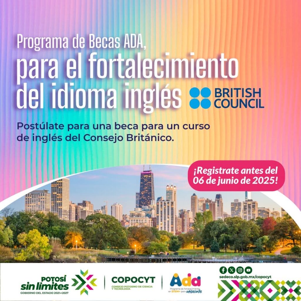 El Consejo Potosino de Ciencia y Tecnología (Copocyt) invita a estudiantes de bachillerato de escuelas públicas y privadas a postularse por una beca para estudiar inglés con el British Council. El curso es gratuito, en línea y al finalizar se entregará certificado oficial.