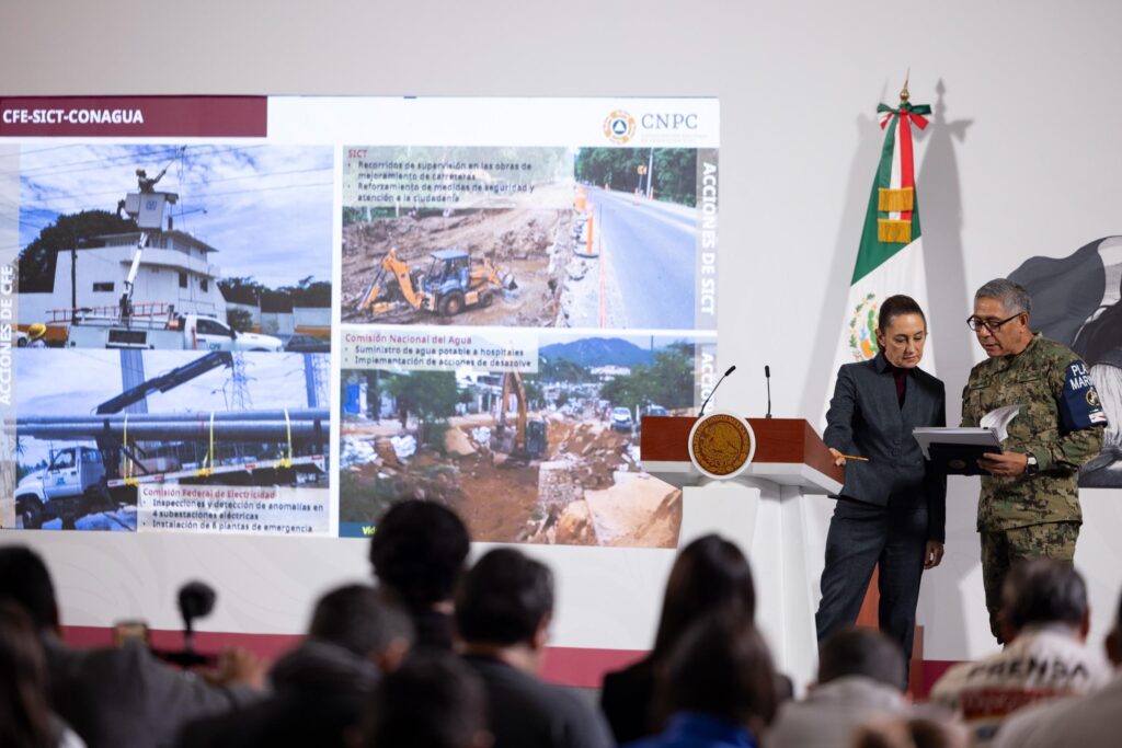A través de un enlace a “La mañanera”, en compañía de la gobernadora de Guerrero, Evelyn Salgado Pinera, la coordinadora Nacional de Protección Civil, Laura Velázquez Alzúa, informó que se han desplegado 21 mil 508 elementos de la Defensa, de los cuales 9 mil 632 se encuentra en Oaxaca y 11 mil 876 en Guerrero; de la Marina hay 9 mil 71 elementos, de ellos 6 mil 418 en Oaxaca y 2 mil 653 en Guerrero, además de que hay presencia de servidores públicos de la Secretaría de Infraestructura, Comunicaciones y Transportes (SICT), de la Comisión Federal de Electricidad (CFE) y la Comisión Nacional del Agua (Conagua).
