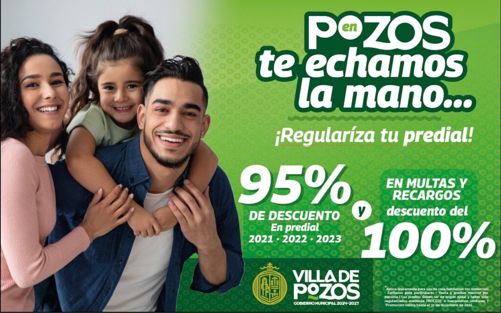 Con el objetivo de apoyar la economía familiar y fomentar la regularización del patrimonio, el Gobierno Municipal de Villa de Pozos, puso en marcha el programa “En Pozos te echamos la mano”, una iniciativa que ofrece importantes beneficios para los propietarios de vivienda que deseen ponerse al corriente en el pago del impuesto predial.