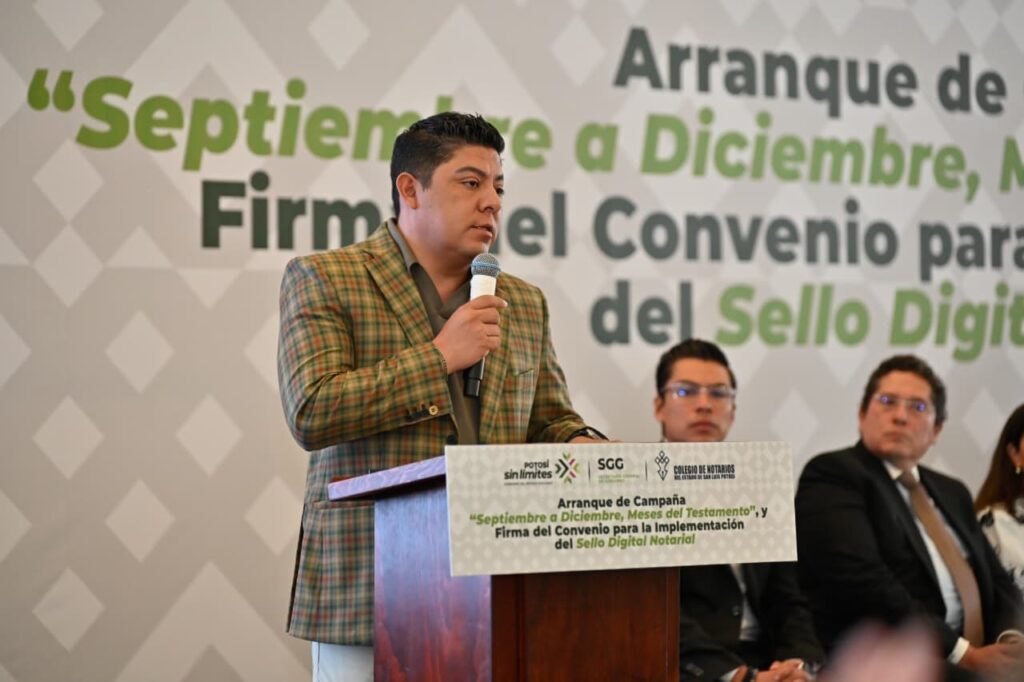 Para brindar mayor certeza jurídica a las y los potosino, el Gobernador de San Luis Potosí, Ricardo Gallardo Cardona, encabezó el arranque de la campaña “Septiembre a diciembre meses del testamento”, así como la firma de convenio para la implementación del sello digital notarial, con el que se garantiza a la ciudadanía que todos sus trámites ante el notario se realicen conforme a derecho, con voluntad de las partes involucradas y con efectos legales justificados.