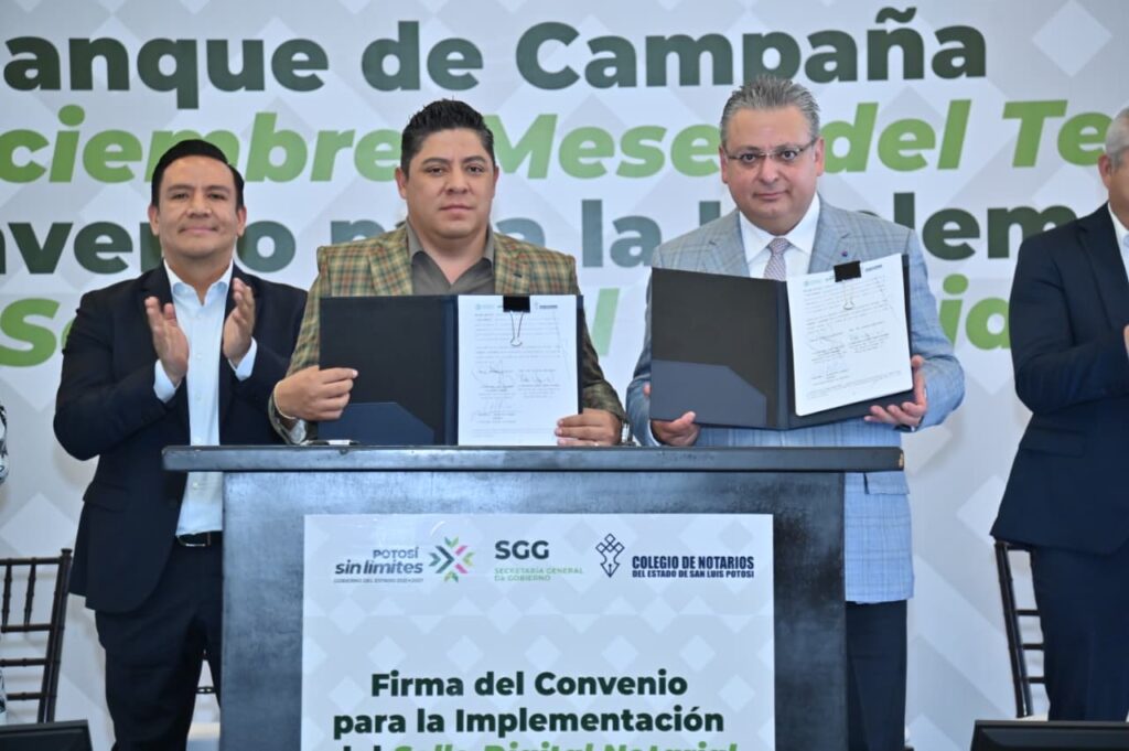 Luego de la firma de convenio para la implementación del Sello Digital Notarial en la Entidad, el presidente del Colegio Nacional del Notariado Mexicano, Ricardo Vargas Navarro, reconoció la disposición y apertura del Gobernador Ricardo Gallardo Cardona para que San Luis Potosí sea el cuarto Estado en aplicarlo para garantizar mayor seguridad jurídica a la ciudadanía.