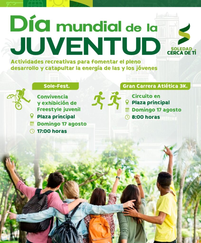 El Ayuntamiento de Soledad de Graciano Sánchez, siguiendo las instrucciones del Alcalde Juan Manuel Navarro Muñiz, invita a toda la población a ser parte de las actividades que se realizarán este domingo 17 de agosto para conmemorar el recién Día Internacional de la Juventud 2025, una fecha que busca visibilizar la fuerza, talento y creatividad de las y los jóvenes, así como fortalecer el tejido social a través del acercamiento con el deporte, la cultura y la convivencia sana.