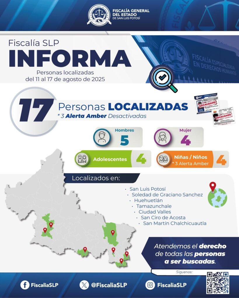 Entre el 11 y el 17 de agosto de 2025, la Fiscalía General del Estado de San Luis Potosí (FGESLP) estableció el paradero de 17 personas que habían sido reportadas como no localizadas en distintos municipios de la entidad, entre ellas tres menores de edad con Alerta Amber, logrando su reintegración a sus respectivas familias.