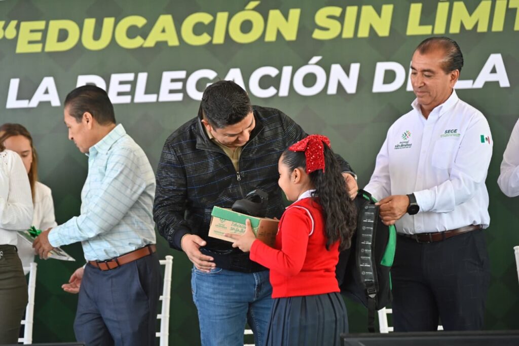 Además de los terrenos gratuitos, el Gobernador Ricardo Gallardo entregó el programa de Educación sin límites en la delegación de La Pila, para niñas y niños, que incluye útiles escolares, mochilas y zapatos, que beneficia a más de 500 mil estudiantes de educación básica de los 59 municipios.