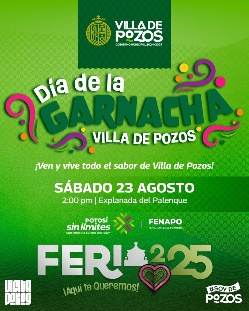 El Municipio de Villa de Pozos, encabezado por la Presidenta Concejal Teresa Rivera Acevedo, participará por primera vez en el tradicional “Día de la Garnacha” dentro de la Feria Nacional Potosina (FENAPO) 2025 que se realizará el sábado 23 de agosto en la Explanada del Palenque a partir de las 14:00 horas, donde cientos de familias podrán degustar lo mejor de la gastronomía popular.