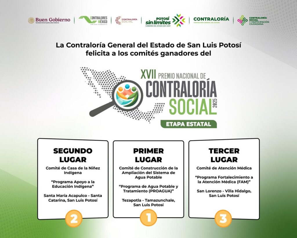 La Contraloría General del Estado (CGE) dio a conocer los resultados de la etapa estatal del Premio Nacional de Contraloría Social. El primer lugar fue para el comité de obra del programa PROAGUA en Tezapotla, Tamazunchale; el segundo lugar, para el comité de la Casa de la Niñez Indígena en Santa María Acapulco, Santa Catarina; y el tercer lugar, para el comité de Atención Médica del programa FAM en San Lorenzo, Villa Hidalgo.