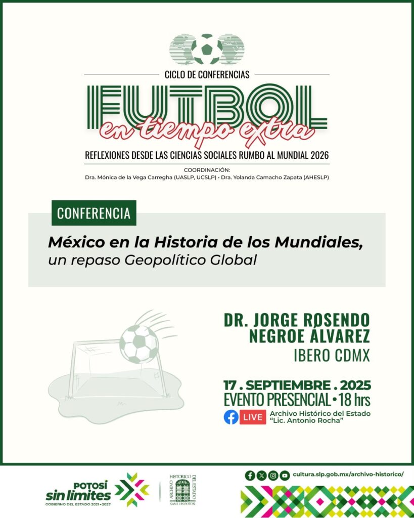 Como parte del ciclo “Fútbol en tiempo extra: reflexiones desde las Ciencias Sociales rumbo al Mundial 2026”, el Archivo Histórico del Estado invita a la conferencia “México en la Historia de los Mundiales, un repaso Geopolítico Global”, que será impartida por el investigador de la Ibero CDMX, Jorge Rosendo Negroe Álvarez, el próximo martes 17 de septiembre a las 18:00 horas en las instalaciones del recinto.