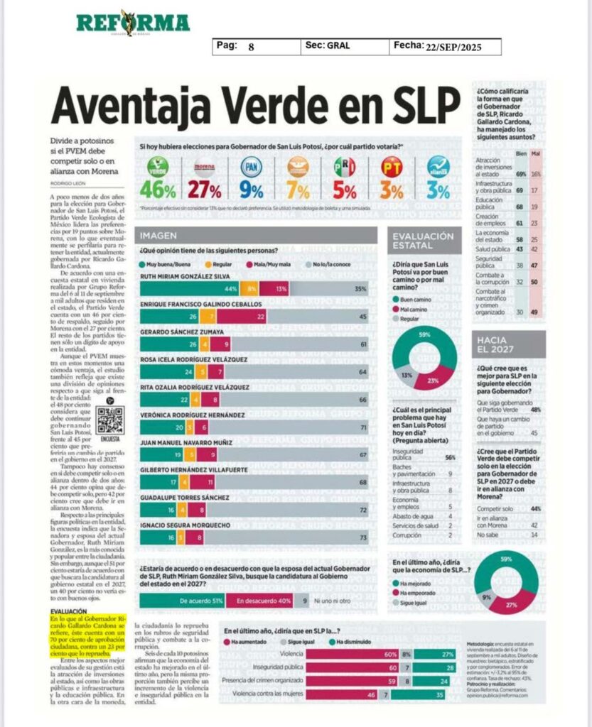 El Partido Verde Ecologista de México (PVEM) en San Luis Potosí se consolida como la fuerza política más fuerte y con mayor respaldo ciudadano rumbo al 2027, de acuerdo con la encuesta publicada este día en el periódico Reforma, uno de los medios nacionales de mayor prestigio.