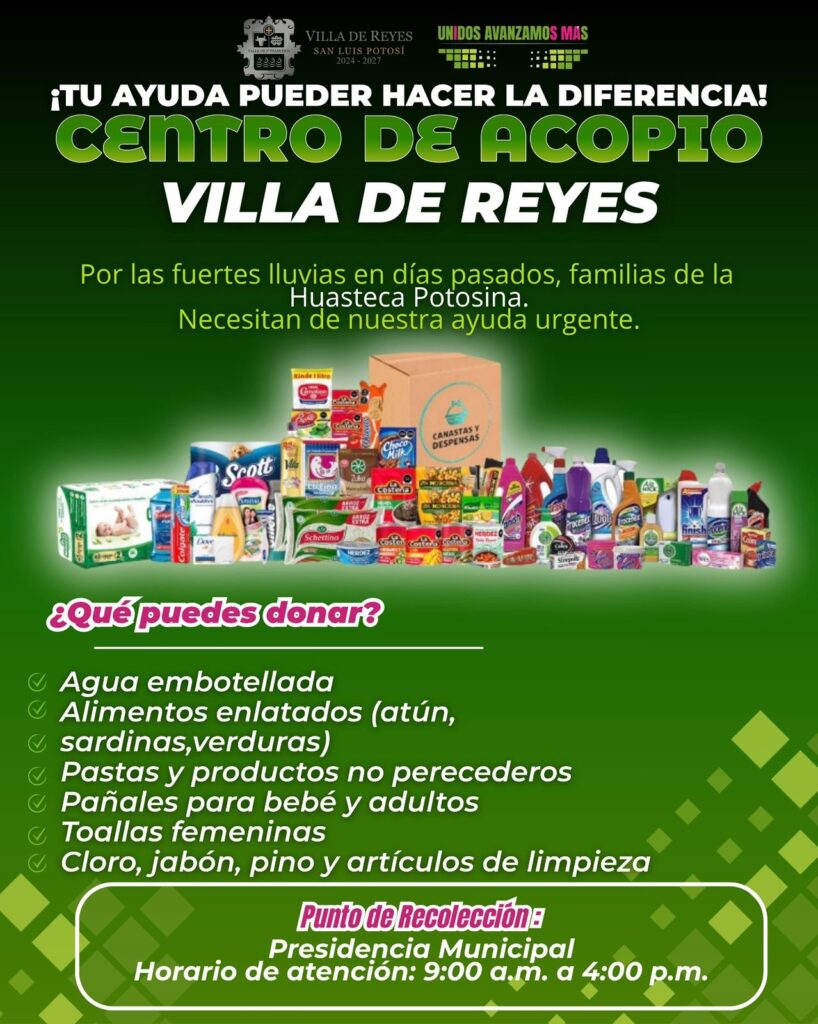 El Gobierno Municipal de Villa de Reyes, encabezado por el alcalde Ismael Hernández Martínez, instaló un centro de acopio con el propósito de reunir ayuda humanitaria para las familias de la Huasteca Potosina que resultaron afectadas por las intensas lluvias registradas en días recientes. El Presidente Municipal hizo un llamado a la ciudadanía para unirse a esta noble causa y demostrar la solidaridad que caracteriza al municipio.