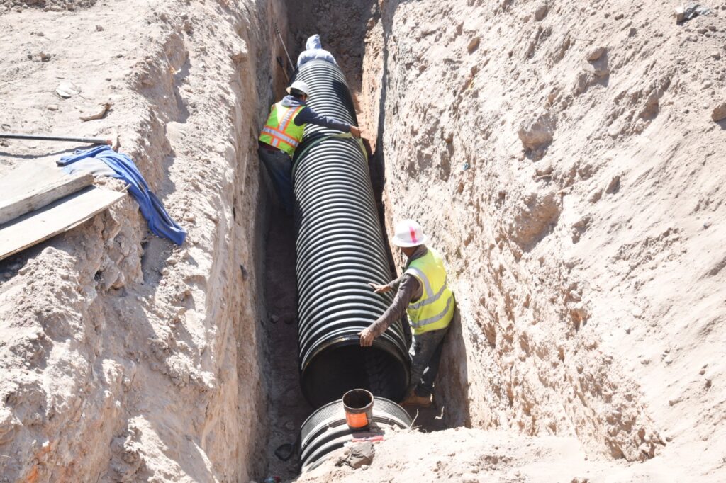 Asimismo, se ha concluido la instalación de 812 metros lineales de tubería de 60 pulgadas para la red principal del colector pluvial, de un total de mil 250 metros previstos, y se realizó el suministro de 720 metros de tubería de 48 pulgadas, con lo cual se refuerza la capacidad de captación y conducción del sistema hidráulico.