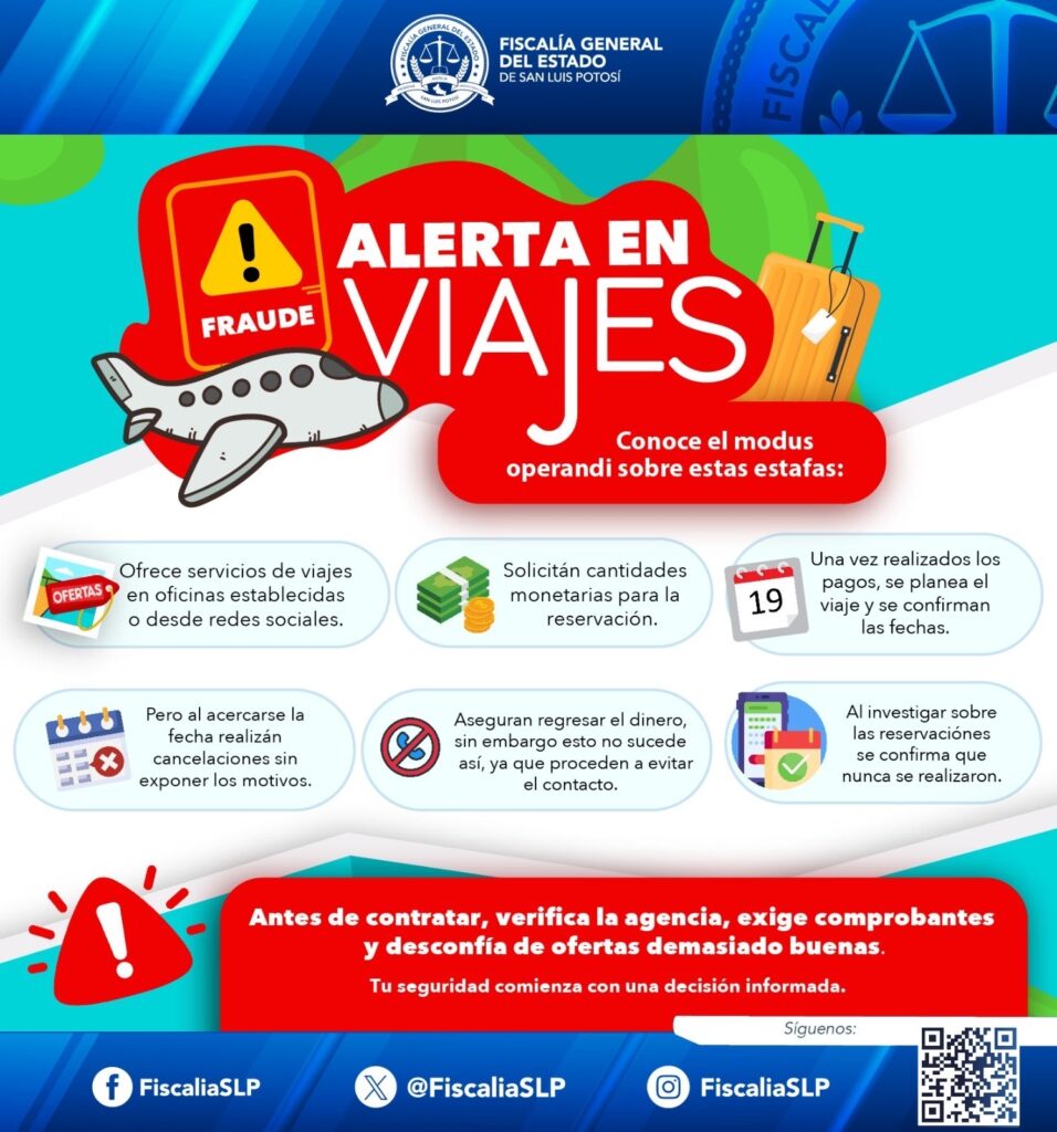 La Fiscalía General del Estado de San Luis Potosí (FGESLP) ha detectado un modus operandi en el que se ofertan viajes vacacionales a precios excesivamente bajos a través de redes sociales y plataformas digitales. Estos fraudes suelen requerir anticipos monetarios para realizar la reservación; sin embargo, al acercarse la fecha del viaje, los estafadores cancelan sin justificación y prometen devoluciones que nunca se concretan.