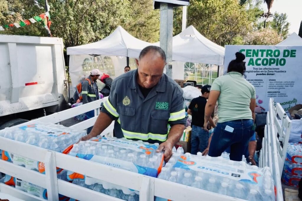 El Gobierno Municipal de Villa de Pozos, encabezado por la Presidenta Concejal Teresa Rivera Acevedo, recolectó más de cuatro toneladas de víveres en los centros de acopio instalados en la Presidencia Municipal y plaza Las Águilas, los cuales partieron a su destino con el propósito de apoyar a las familias damnificadas de la zona Huasteca que se vieron afectadas por las intensas lluvias registradas en días pasados.
