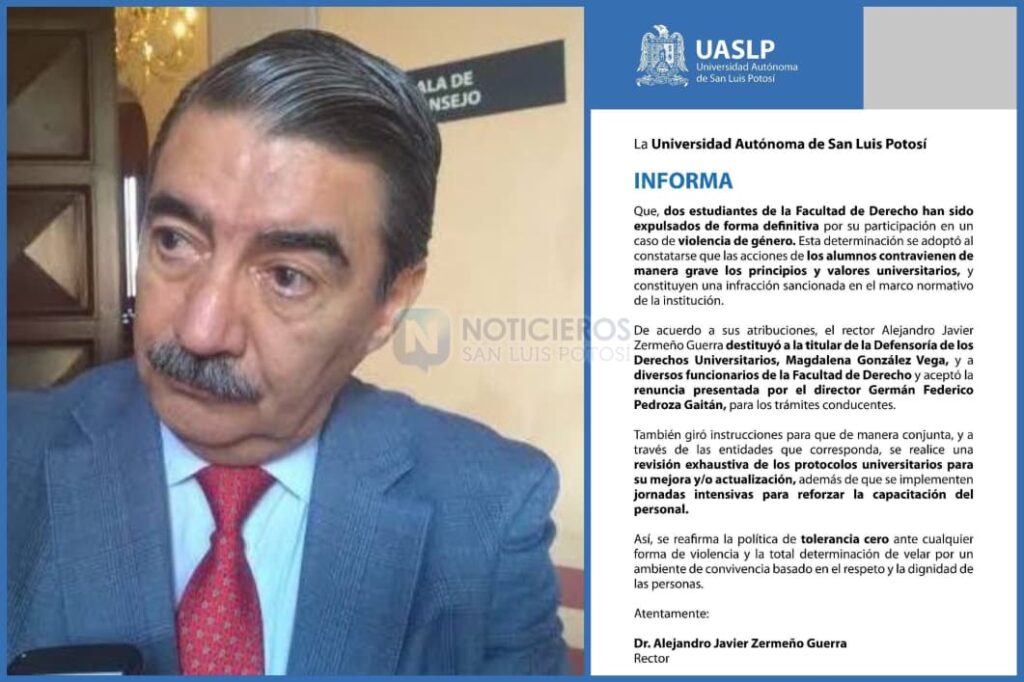 La Universidad Autónoma de San Luis Potosí comunicó la expulsión de dos alumnos y la destitución de funcionarios, incluyendo a la titular de la Defensoría de los Derechos Universitarios, Magdalena González Vega, y al director de la Facultad de Derecho, Germán Pedroza Gaitán, como respuesta a los hechos ocurridos dentro de sus instalaciones.