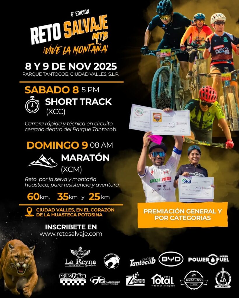 En este impulso, se presentó el “Reto Salvaje MTB 2025”, una de las pruebas más esperadas del ciclismo de montaña, que se realizará los días 8 y 9 de noviembre en Ciudad Valles, con sede en el Parque Tantocob. Bajo el lema “¡Vive la Montaña!”, los competidores enfrentarán las modalidades Short Track (XCC) y Maratón (XCM), recorriendo 60, 35 y 25 kilómetros de pura adrenalina, resistencia y pasión por el deporte.