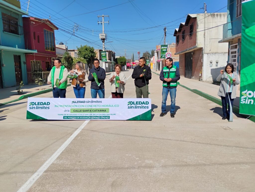 El Ayuntamiento de Soledad de Graciano Sánchez entregó la pavimentación de la Calle Santa Catarina, en la Colonia San Felipe, una obra largamente esperada por los vecinos de la zona. Durante el evento, una beneficiaria agradeció al alcalde, Juan Manuel Navarro Muñiz, por atender una solicitud que llevaba años pendiente y que hoy mejora la movilidad y seguridad de la comunidad.