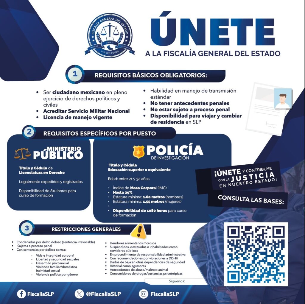 La Fiscalía General del Estado de San Luis Potosí (FGESLP) informa que, del 14 de noviembre al 31 de diciembre de 2025, se inicia el registro para la convocatoria de ingreso para agentes del Ministerio Público y de la Policía de Investigación.