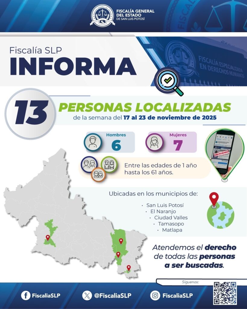 La Coordinación de Alerta Amber y la Unidad de Personas No Localizadas y Desaparecidas de la Fiscalía Especializada en Materia de Derechos Humanos informan a la ciudadanía que, gracias a un trabajo conjunto con autoridades federales, estatales y municipales, además de la valiosa colaboración de la sociedad, se logró la localización con vida de 13 personas en diferentes puntos del estado potosino.