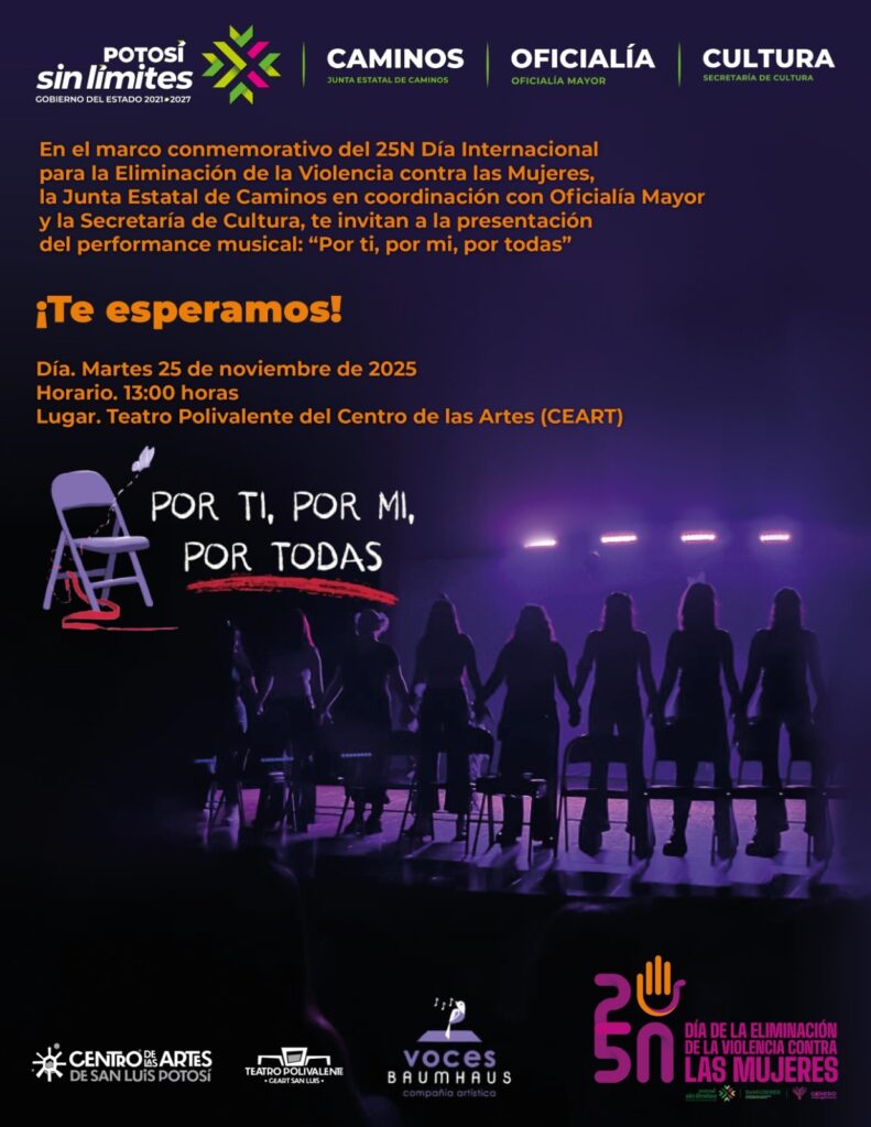 En el marco del Día Internacional para la Eliminación de la Violencia contra la Mujer, la Junta Estatal de Caminos (JEC), en colaboración con la Oficialía Mayor (OM) y la Secretaría de Cultura (Secult), conmemorará el 25N con el performance musical “POR TI, POR MI, POR TODAS”, interpretado por la compañía artística Voces Baumhaus.