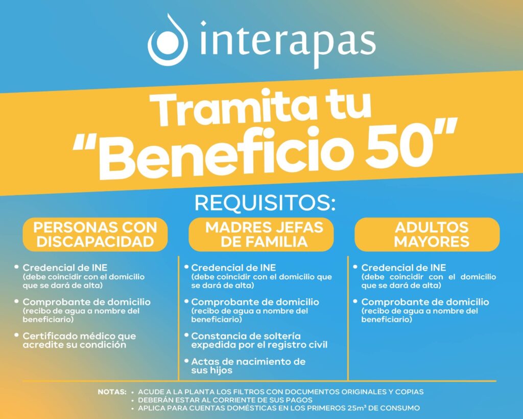 El programa “Beneficio 50” sigue vigente y ofrece un descuento del 50 por ciento en el pago del servicio de agua para adultos mayores, madres solteras y personas con discapacidad, en los primeros 25 metros cúbicos de consumo bimestral.