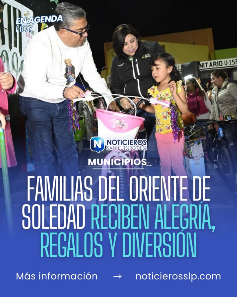 Juan Manuel Navarro Muñiz, Alcalde de Soledad de Graciano Sánchez, cumplió el quinto día llevando un mensaje de paz y alegría a las familias del municipio; en esta ocasión, familias de la zona oriente recibieron estas emocionantes Posadas navideñas, al recorrer las colonias Villa Alborada, Primera de Mayo, Quintas de la Hacienda, Cactus y La Sierra, donde entregó juguetes a niñas y niños y cobijas a adultos mayores, como parte de una estrategia de cierre de año enfocada en llevar bienestar directo a los hogares.