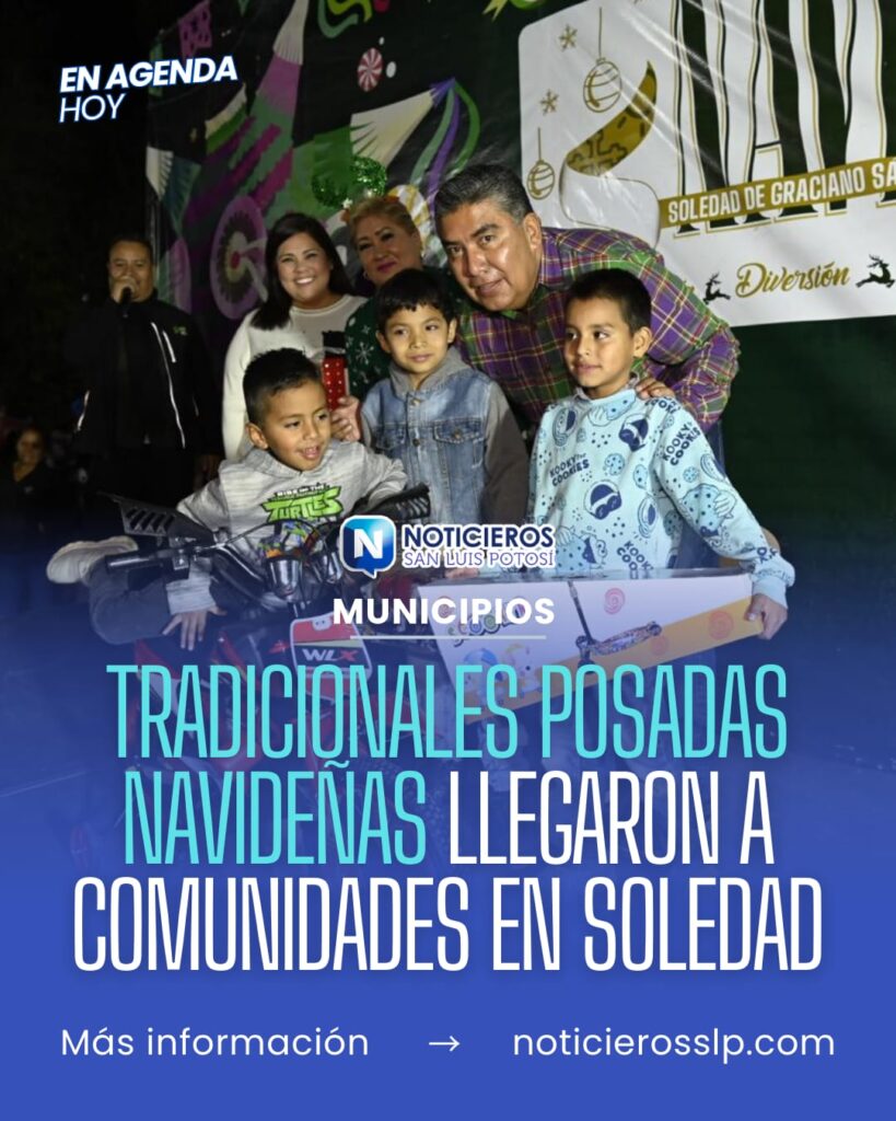 Bajo la política de estar siempre cerca de todas las familias de Soledad de Graciano Sánchez, el Alcalde, Juan Manuel Navarro Muñiz, visitó diversas comunidades en el marco de las Posadas Navideñas, en vísperas de la Navidad, alegrando los rostros de niños y niñas, jóvenes y adultos mayores, con música, entretenimiento sano y obsequios como juguetes y cobertores como parte del Programa Invernal.