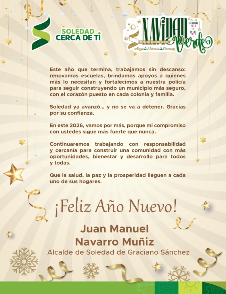Ante el comienzo de un nuevo año 2026, Juan Manuel Navarro Muñiz, Presidente Municipal de Soledad de Graciano Sánchez, deseó a todas las y los habitantes del municipio un cierre lleno de esperanza, unidad y alegria en sus hogares, en donde cada propósito personal y comunitario se cumpla a lo largo del año venidero; destacó el ritmo de trabajo de este año, en el que se lograron cambios profundos en la vida de las y los soledenses.