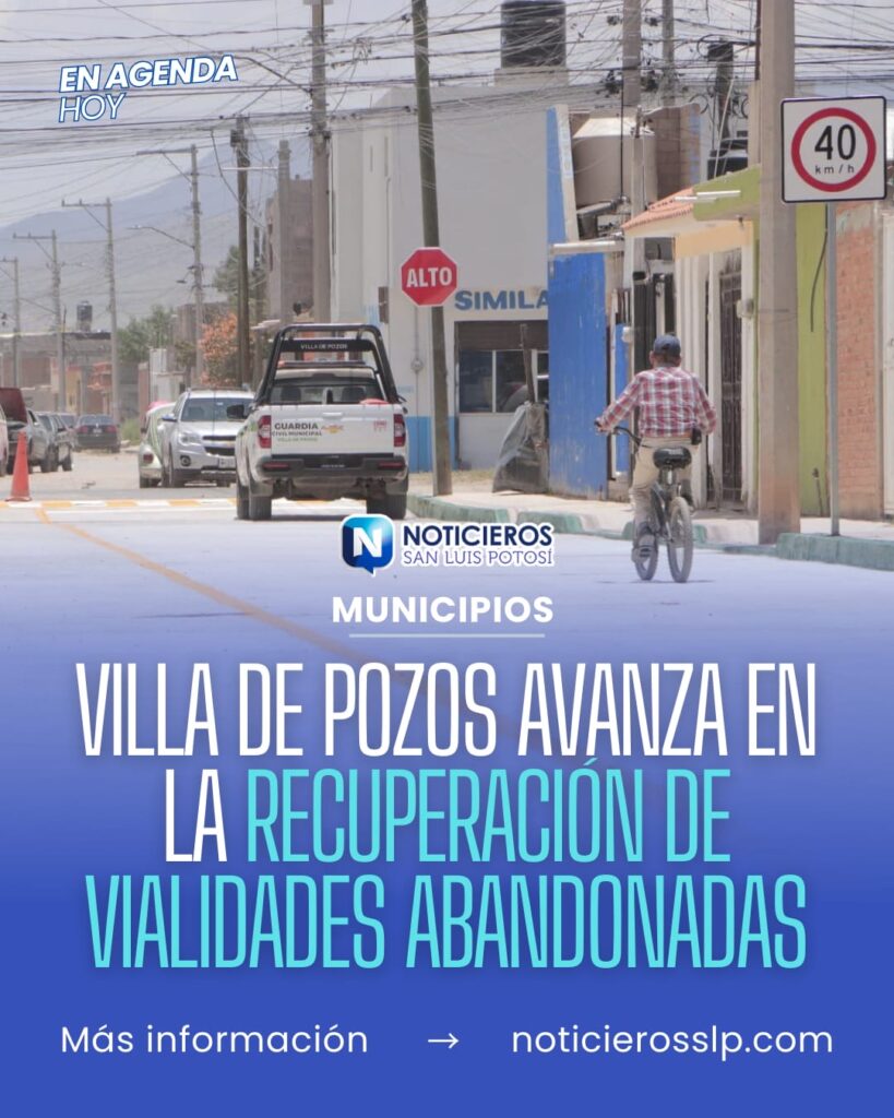 Durante el 2025, el Gobierno Municipal de Villa de Pozos, encabezado por la Presidenta Concejal Paty Aradillas, llevó a cabo la entrega de importantes vialidades que permanecieron en abandono por más de tres décadas, además de iniciar la rehabilitación de diversas calles y avenidas estratégicas que beneficiarán de manera directa a peatones y automovilistas, al mejorar las condiciones de movilidad y seguridad en la localidad.