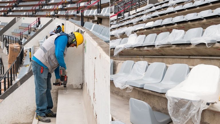 Las redes sociales han mostrado avances en la instalación de los asientos, que llevarán temporalmente el nombre del patrocinador Banorte. Las secciones combinan colores rojo, blanco y gris, y la fase final de las obras incluye la colocación del nuevo césped híbrido y la modernización de tribunas.