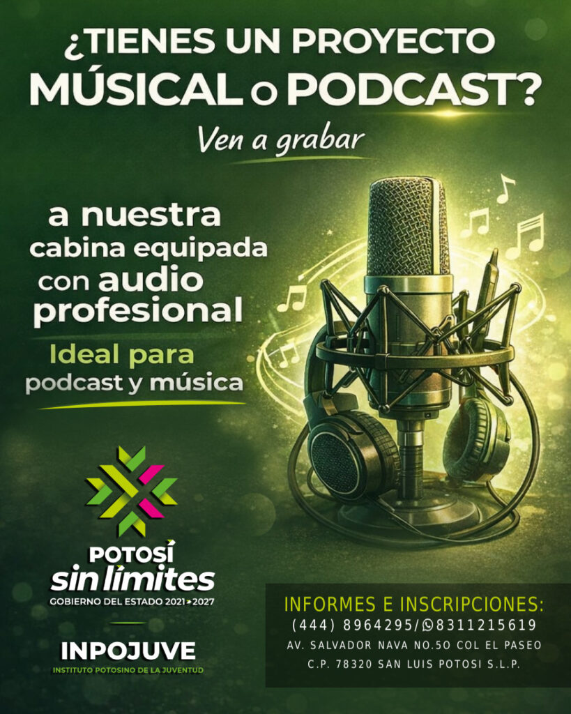 El Instituto Potosino de la Juventud (Inpojuve) lanzó la convocatoria para el uso de su cabina de grabación profesional, una iniciativa dirigida a las y los jóvenes de San Luis Potosí que buscan fortalece su talento artístico y creativo. El proyecto ofrece un entorno técnico especializado para la producción de música, canciones, podcasts y otros contenidos sonoros.