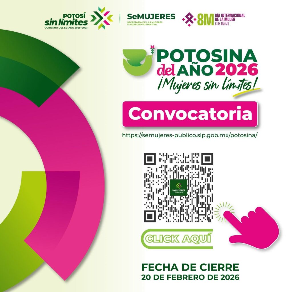 La Secretaría de las Mujeres e Igualdad Sustantiva (Semujeres) invitó a postular a mujeres destacadas de San Luis Potosí para el certamen “Potosina del Año Mujeres Sin Límites” 2026, a realizarse el 8 de marzo, en el marco del Día Internacional de la Mujer. La convocatoria reconoce a mujeres cuyo trabajo ha impactado positivamente en distintos ámbitos, reflejando el cambio que se vive y se siente en la participación de las potosinas.