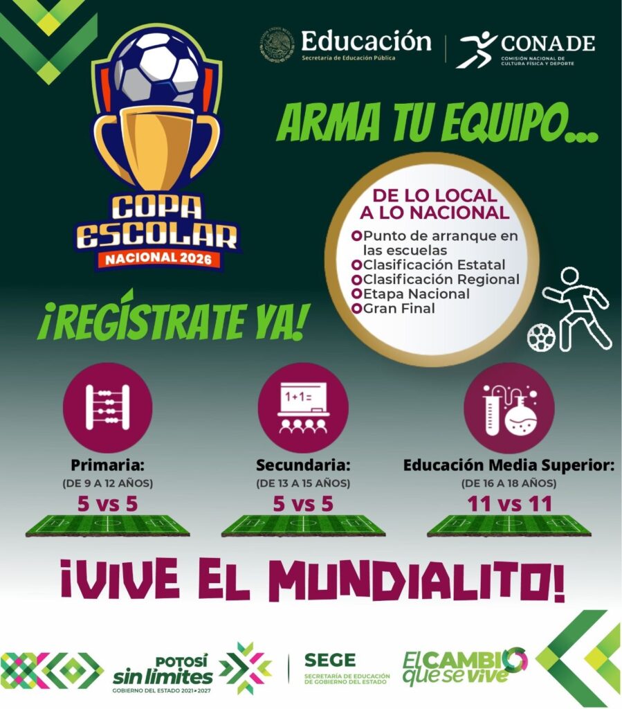 La Secretaría de Educación del Gobierno del Estado convoca a estudiantes de educación básica y media superior a participar en la Copa Escolar de Futbol 2026, fase estatal, cuyo objetivo es fomentar valores como la disciplina, el trabajo en equipo y la sana convivencia, además de seleccionar al equipo que representará a San Luis Potosí en la etapa nacional.