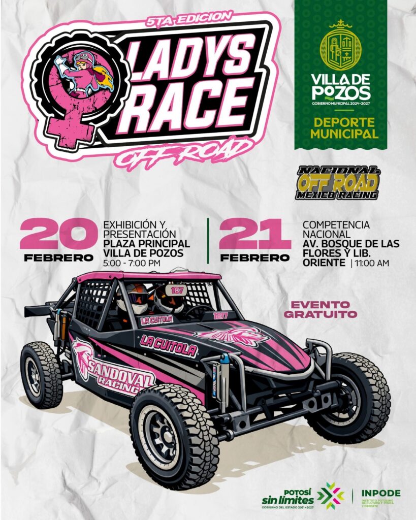 El Gobierno de Villa de Pozos, a través de la Dirección de Deporte y en coordinación con National Off Road México Racing, llevará a cabo la quinta edición de la competencia nacional “Ladys Race Off Road”, evento en el que el municipio será sede y que reunirá a destacadas pilotos de diferentes estados del país.
