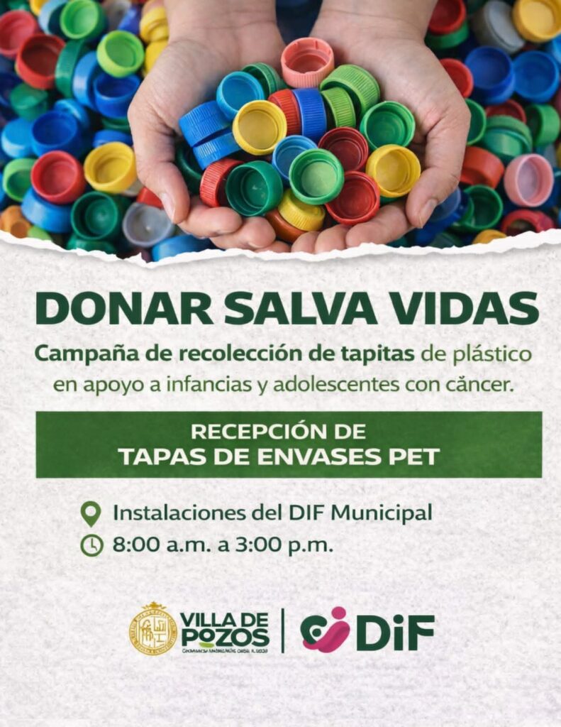El Sistema Municipal para el Desarrollo Integral de la Familia (DIF) en Villa de Pozos ha lanzado una campaña de recolección de tapas de plástico, destinada a generar recursos para apoyar a niños y adolescentes que enfrentan tratamientos oncológicos. La recepción de las tapitas se realizará en las instalaciones del organismo, ubicadas en la calle Villerías número 305, en la cabecera municipal.