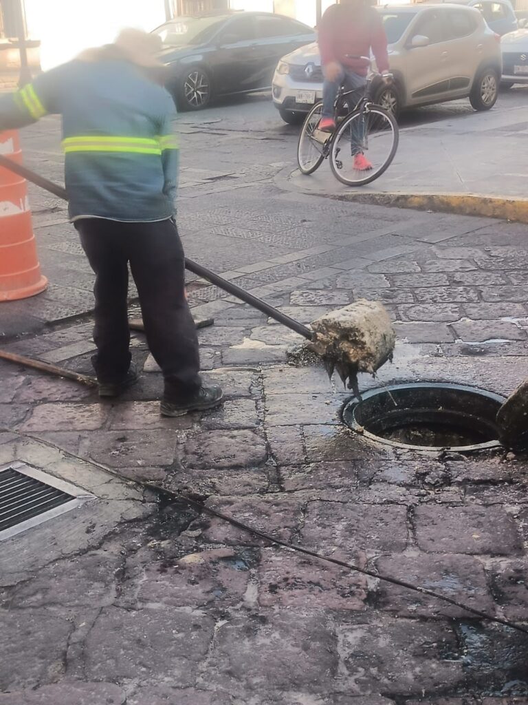 Obstrucción por grasa vegetal causa fuga de aguas residuales en el Centro Histórico de San Luis Potosí