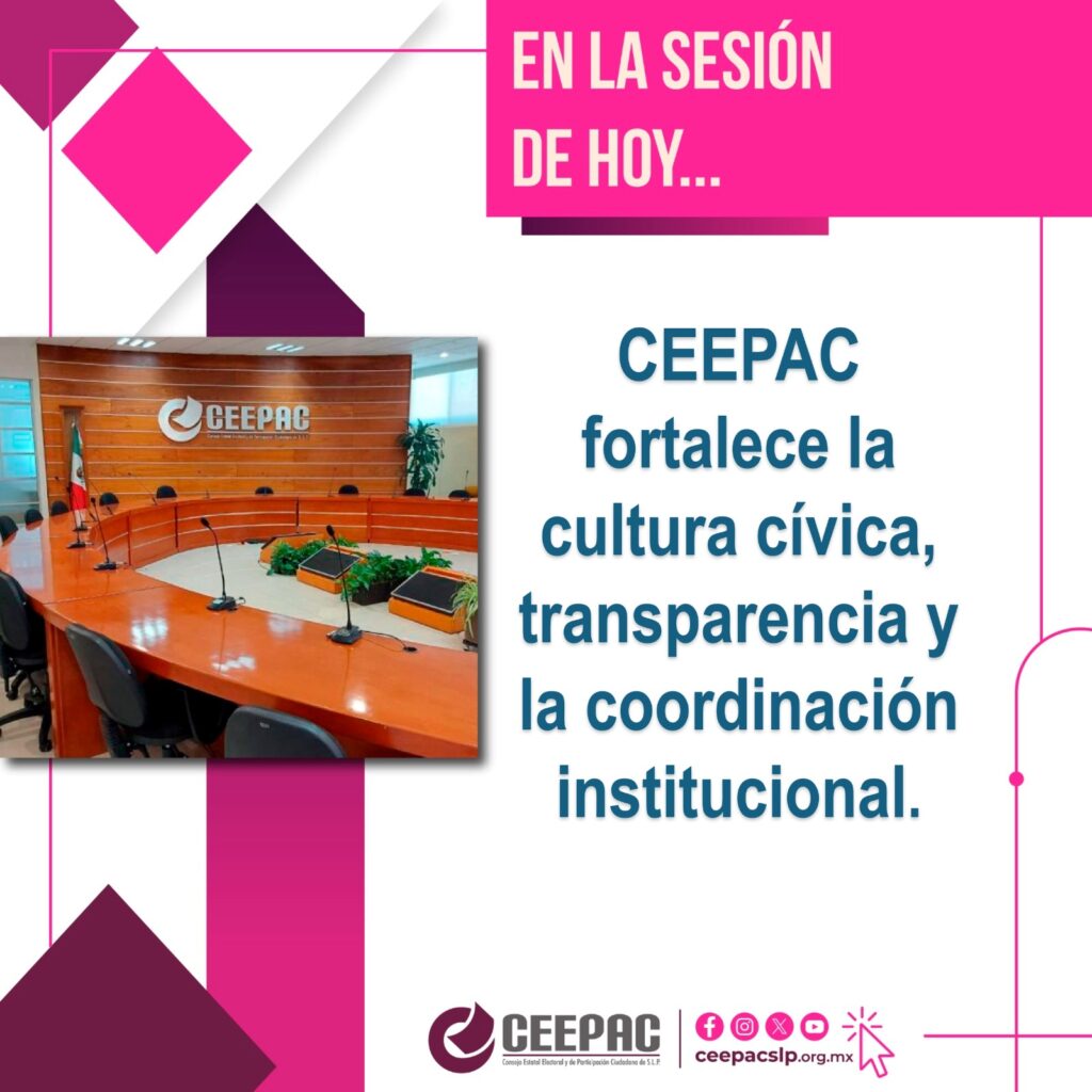 El Consejo General del Consejo Estatal Electoral y de Participación Ciudadana (CEEPAC) de San Luis Potosí llevó a cabo una sesión ordinaria en la que presentó y aprobó diversos acuerdos e informes. Las acciones están orientadas al fortalecimiento institucional, la transparencia, la cultura cívica y la coordinación interinstitucional.