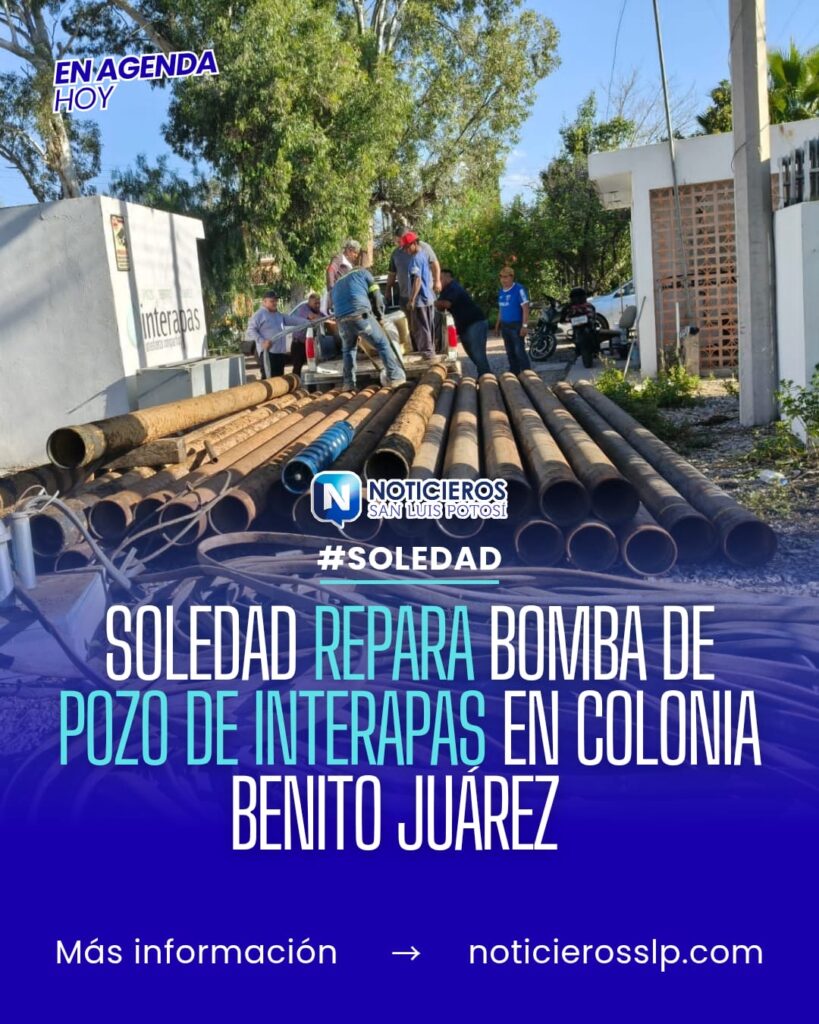 El Ayuntamiento de Soledad de Graciano Sánchez, en coordinación con el organismo Interapas, realizó este domingo la instalación de una nueva bomba en un pozo de la colonia Benito Juárez, tras una falla reportada desde el pasado miércoles que dejó sin servicio de agua a más de 15 mil habitantes.