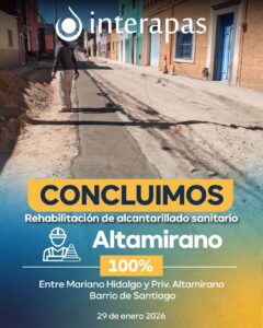 INTERAPAS terminó los trabajos de renovación del drenaje sanitario en la calle Altamirano, entre Mariano Hidalgo y Privada de Altamirano...